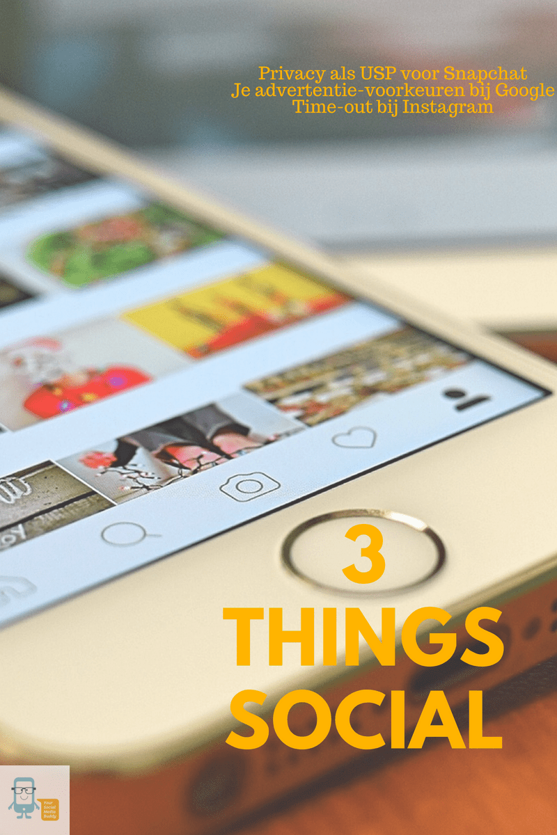 Deze week bespreek ik de volgende 3 dingen: de privacy split tussen Snapchat en Facebook, je advertentie-voorkeuren aanpassen in Google (en je tegelijkertijd je privacy bewaakt), en de time-out van Instagram.